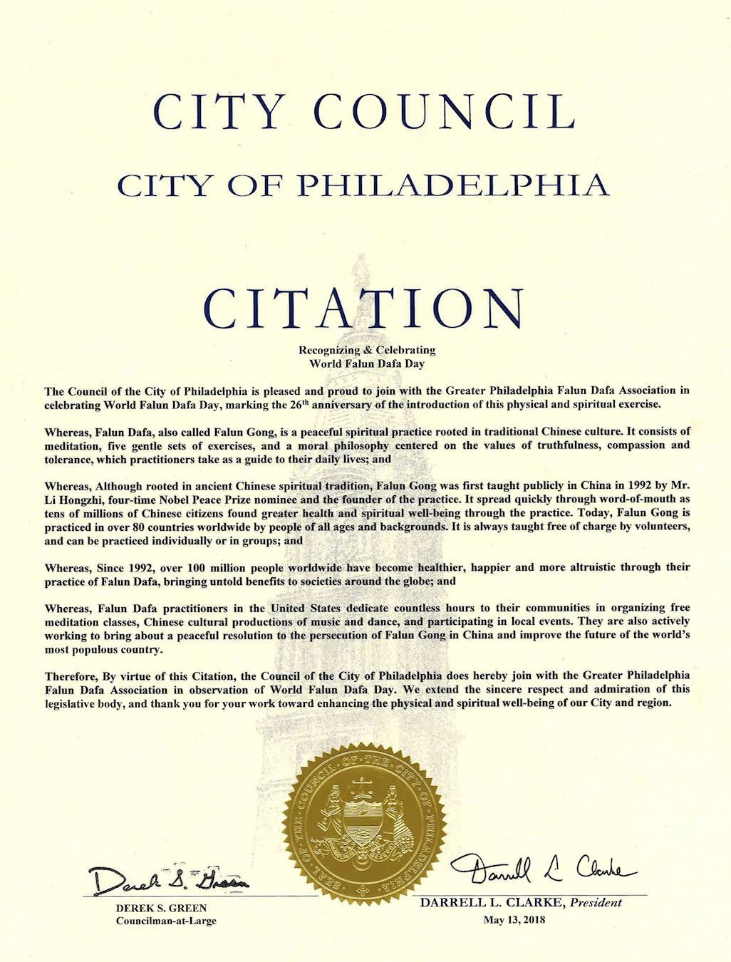 費城市議會高興和自豪地加入大費城法輪大法學會慶祝世界法輪大法日,這也是這個身體與精神修煉的功法傳世二十六週年的日子」。