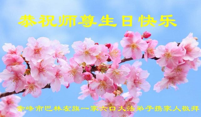 內蒙古自治區赤峰市巴林左旗一家六口大法弟子攜家人恭祝師尊生日快樂!