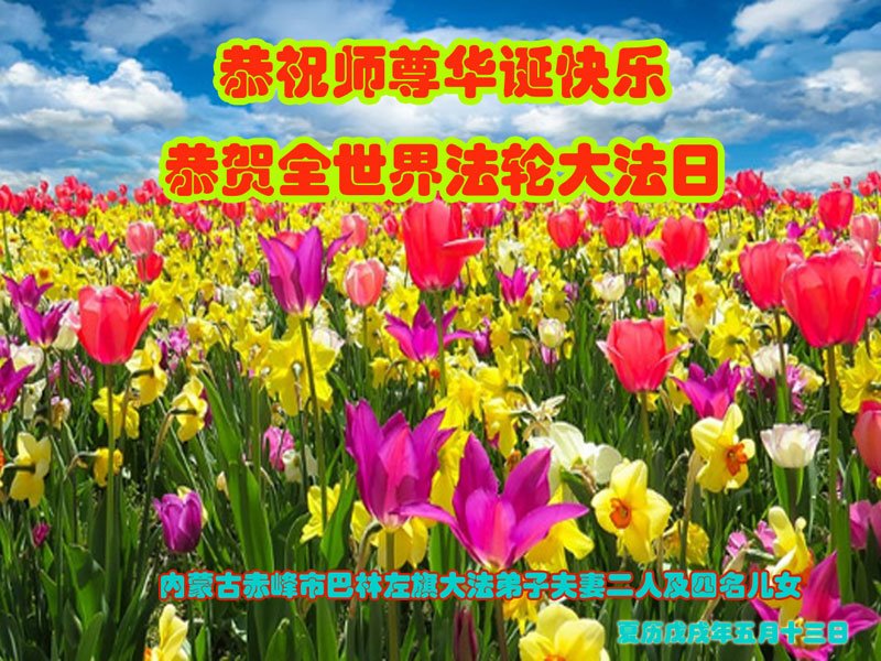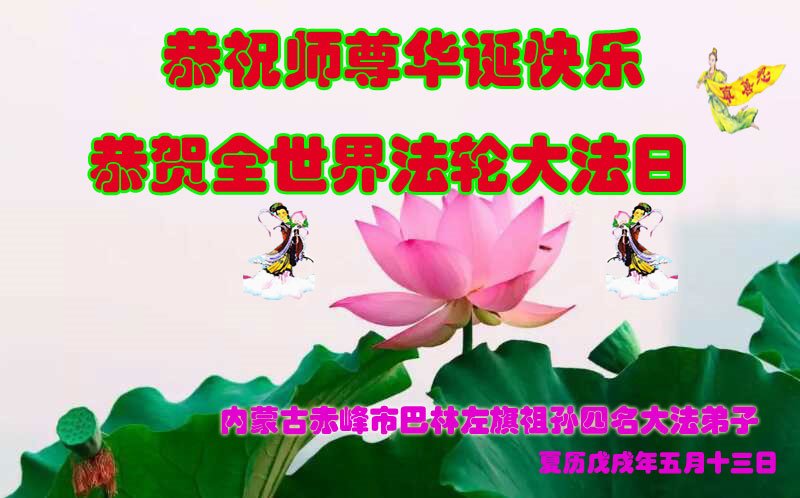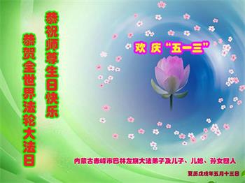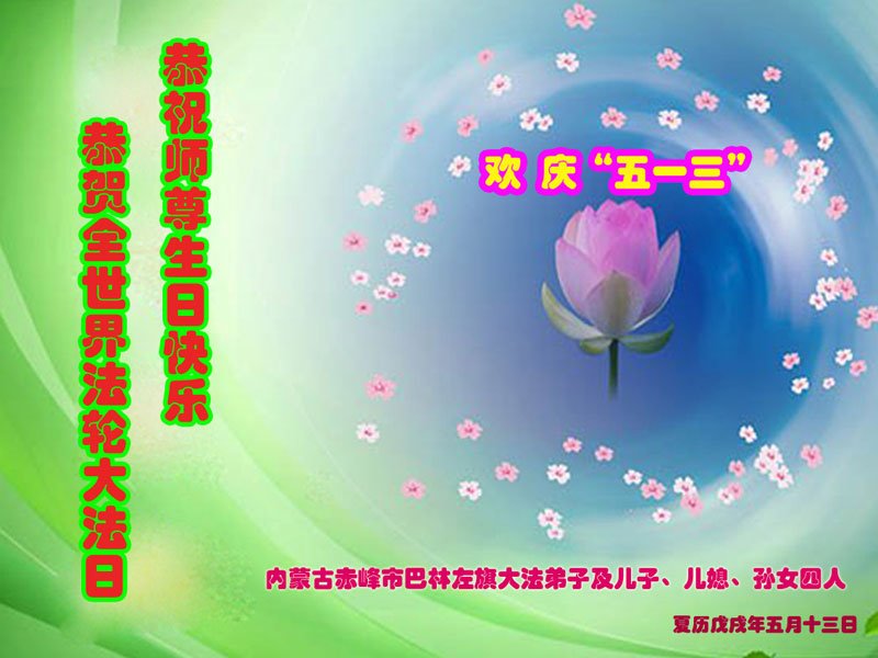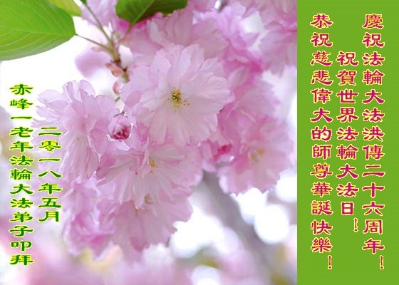 內蒙古自治區赤峰一老年法輪大法弟子恭祝師尊生日快樂!祝賀世界法輪大法日!慶祝法輪大法洪傳二十六週年!