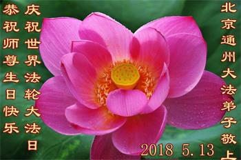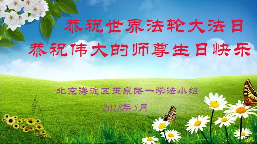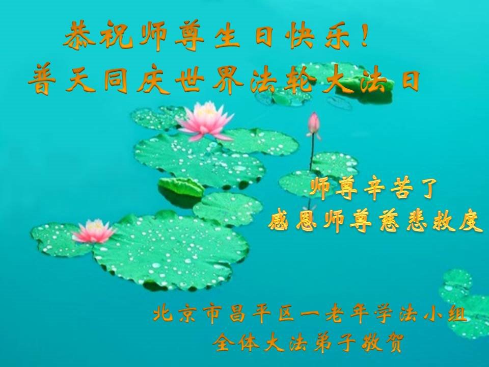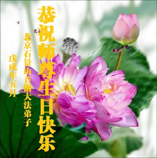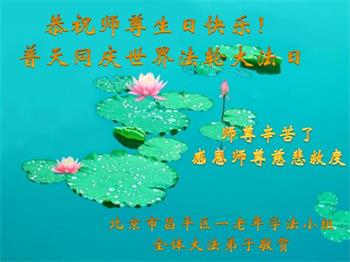 我們是北京海澱山後的大法弟子,在這法輪大法日和師父生日即將到來之日,我們遙祝慈悲偉大的師父生日快樂!我們沒法用語言表達我們激動的心情,只能用實際行動來報師恩,報師父慈悲的救度。