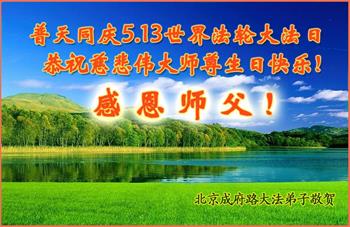 在5.13世界法輪大法日來臨之際,北京海澱區成府路大法弟子向慈悲偉大的師尊致以最崇高的敬意!並恭祝偉大師尊67歲華誕生日快樂!師父您好!師父您辛苦了!師父謝謝您!