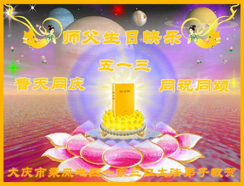值此世界法輪大法日來臨之際,本人與家人同修感恩師尊的慈悲救度之恩,弟子叩拜師恩。祝師尊節日快樂! 大慶新村大法弟子