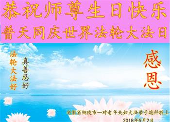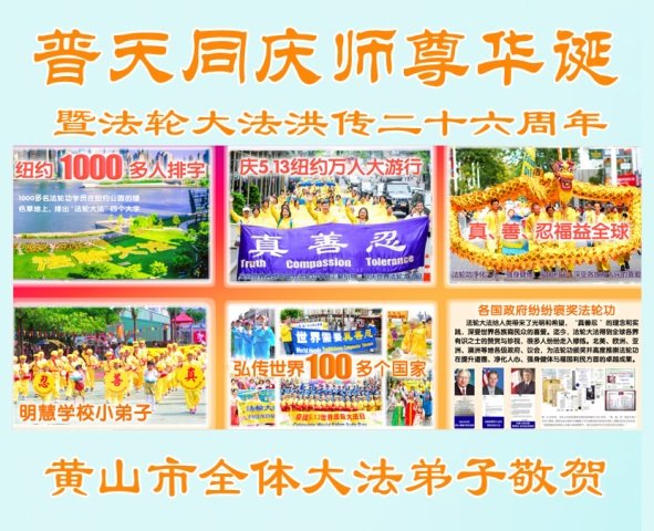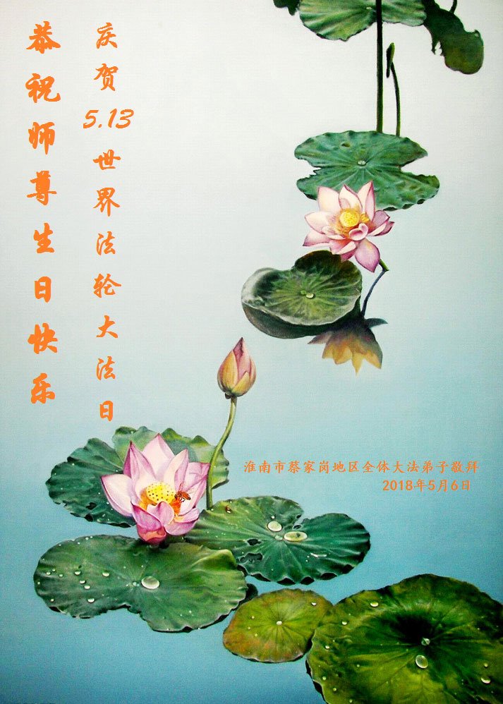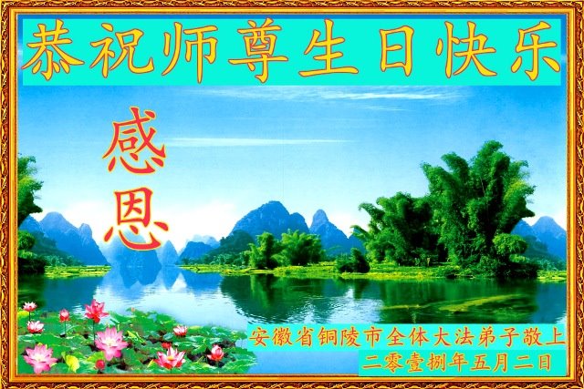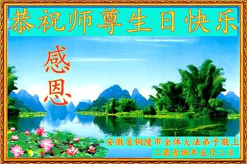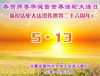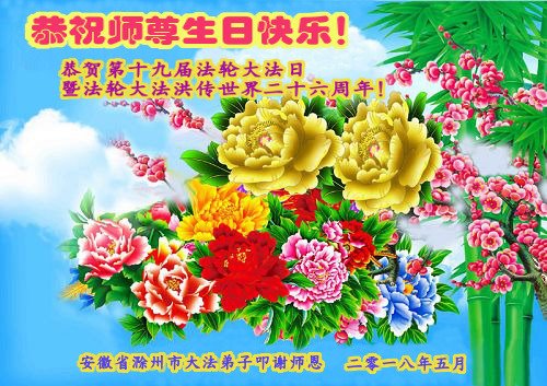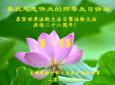 安徽省滁州市大法弟子叩謝師恩,恭祝師尊生日快樂!恭賀第十九屆世界法輪大法日暨法輪大法洪傳世界二十六週年!
