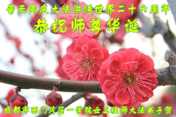 四川省成都一學院女工程師大法弟子恭祝師尊華誕!普天同慶大法洪傳世界二十六週年!