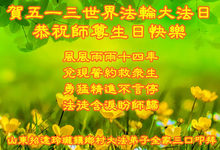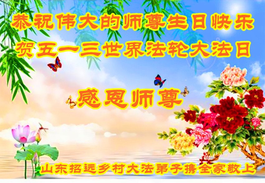 山東煙台招遠玲瓏鎮鄉村大法弟子攜五口之家恭祝師尊生日快樂!