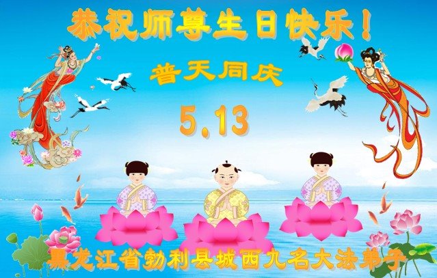 黑龍江省七台河市勃利縣城西九名大法弟子恭祝慈悲偉大師尊生日快樂!慶祝5.13世界法輪大法日!