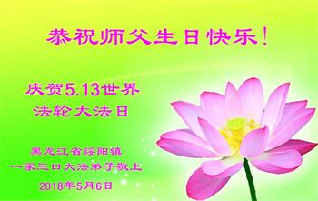 黑龍江省綏陽鎮一家三口大法弟子恭祝師父生日快樂!慶賀世界法輪大法日!
