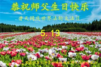 在這普天同慶法輪大法傳世二十六週年、共慶「五一三世界法輪大法日」的美好時刻,我們全體大法弟子向慈悲偉大的師尊獻上心底最真摯的祝願:師父您好!師父您辛苦了!弟子們感謝師尊的慈悲苦度!二十六年的風風雨雨,您用巨大的承受和付出把我們救度!二十六年的日日夜夜,您為弟子和眾生耗費了無數心血!您把我們撈起,用大法把我們洗淨,蕩盡污濁塵垢,再賦予我們神聖的「正法時期大法弟子」的榮耀。弟子們感恩師尊!感恩師尊的慈悲救度!在這最後的時刻,我們一定盡全力去做好三件事,救度世人與眾生,珍惜師尊用巨大承受換來的分分秒秒,兌現史前大願,精進再精進,不負眾生期盼,不負師尊苦度!