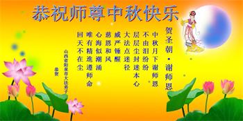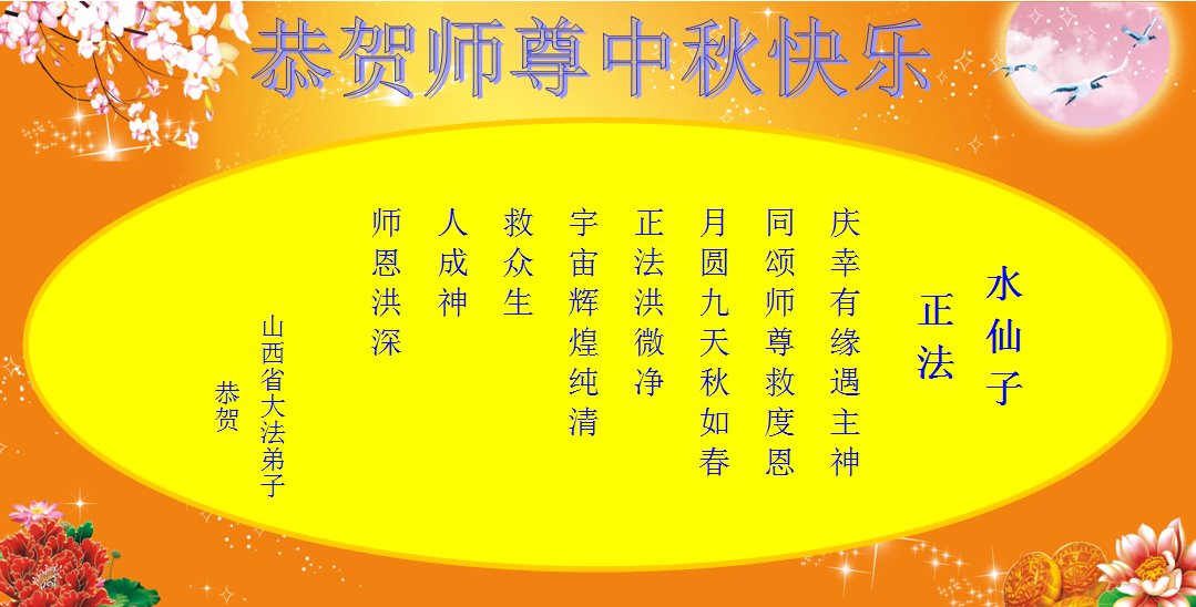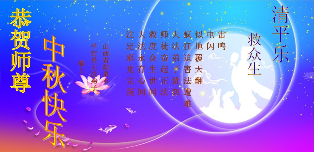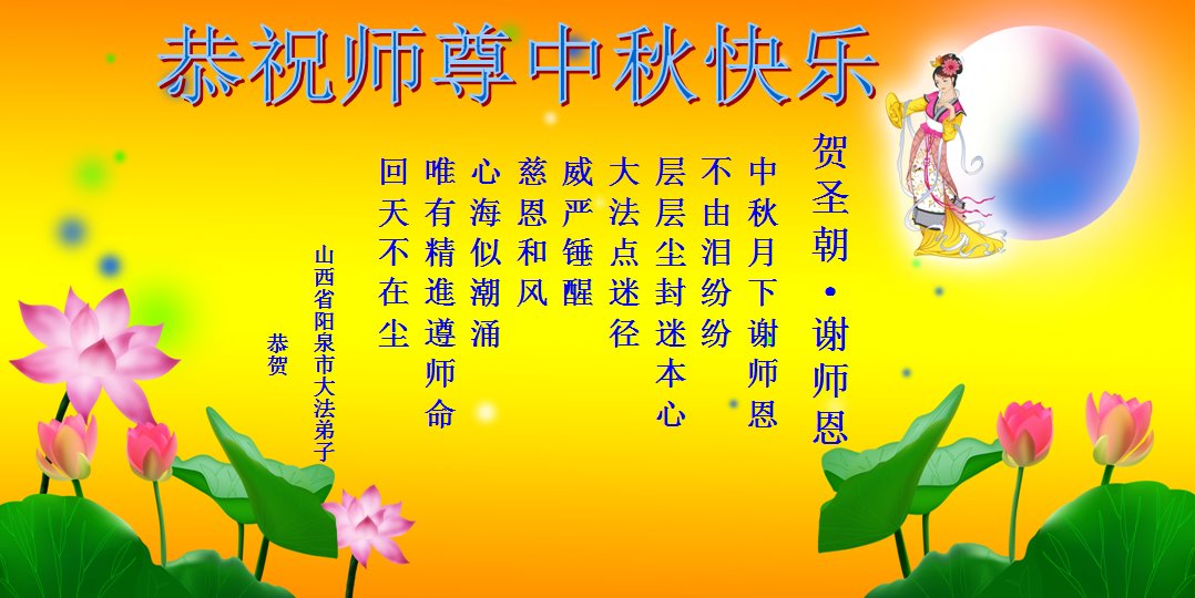 在中秋節到來之際,山西陽泉地區的全體大法弟子向慈悲偉大的師尊問聲:師尊您好!師尊辛苦了!祝慈悲偉大的師尊中秋節快樂!