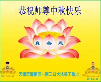 恭祝慈悲偉大的恩師中秋快樂!又是一年中秋團圓之時,弟子倍加想念恩師,更加感恩慈悲偉大的師尊的慈悲救度。用盡人類的語言,也無法表達師恩浩蕩。弟子一定不辜負師尊洪恩,謹遵恩師教誨,同化大法,精進實修,從一思一念一言一行一舉一動上都嚴格要求自己,正念正行,助師正法,做好三件事,圓滿隨師還!天津濱海新區一家三口大法弟子叩拜恩師!