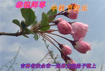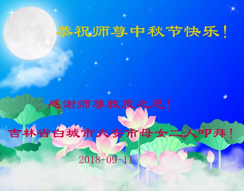 恭祝慈悲偉大的師尊中秋節佳節快樂!一年來我們在生與死的考驗中,在師尊的慈悲呵護下走過來了。我們查找不足,及時向內找,修好自己。走好走正今後的修煉路,堅定實修,百分之百信師信法,做好三件事,做合格的正法時期的大法弟子。