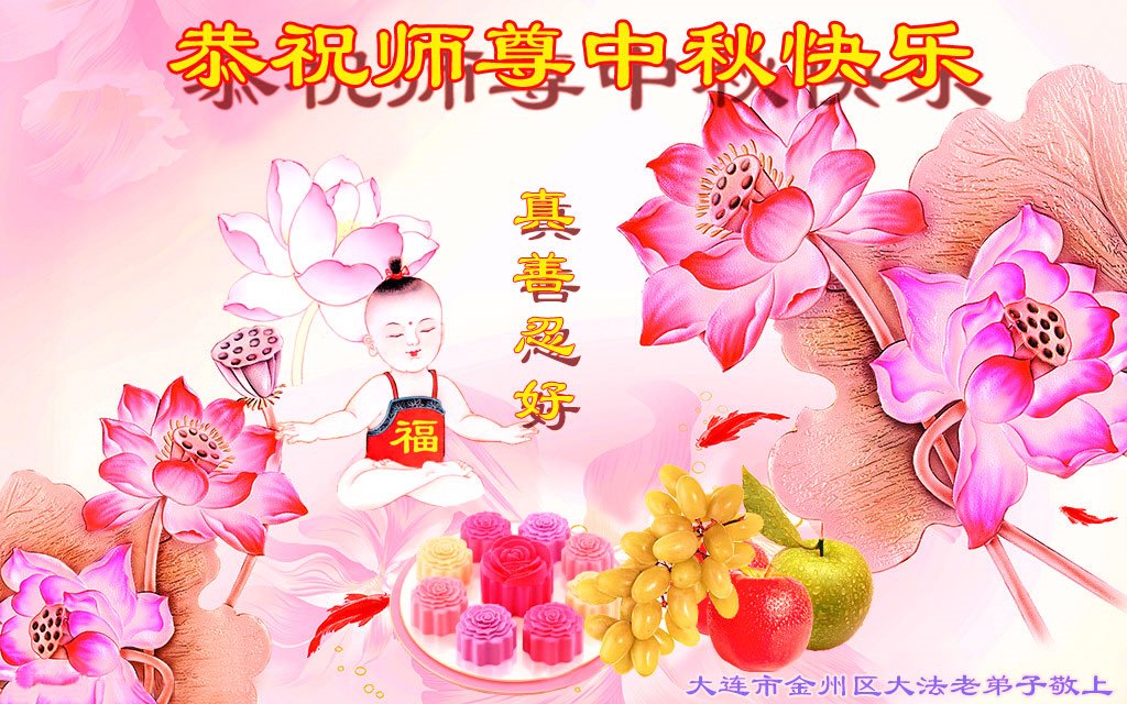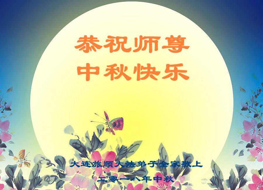 慈悲偉大的師尊您好!時間如穿梭,在傳統的親人團聚的中秋佳節來臨之際,我們夫妻大法弟子及全家人帶著我們對師尊的無比思念、無比感恩的心情祝慈悲的師尊中秋節快樂!作為大法弟子,我們知道我們的責任,在剩下不多的正法日子裏,一定奮起直追,牢記師尊的教導,紮紮實實的學好法,做好三件事,向內找,修好自己。早日隨師回家!大連市一老年夫妻大法弟子及全家叩拜恩師!