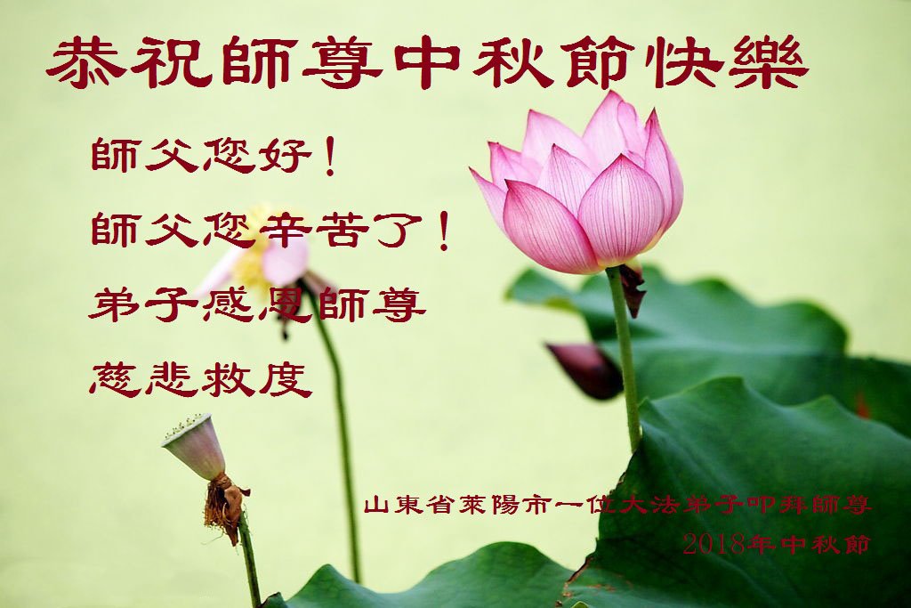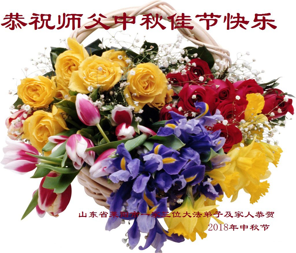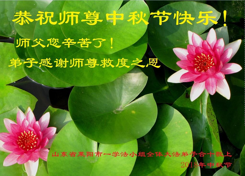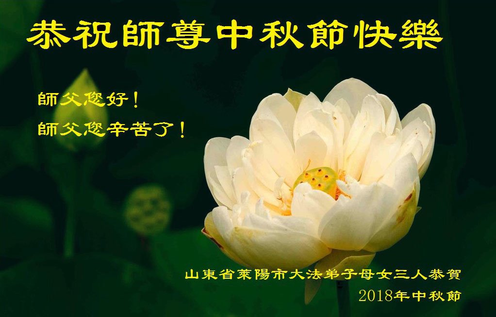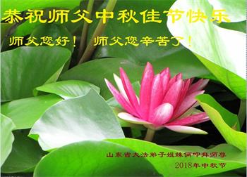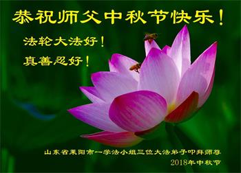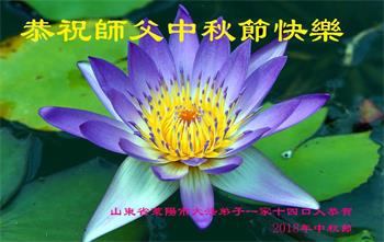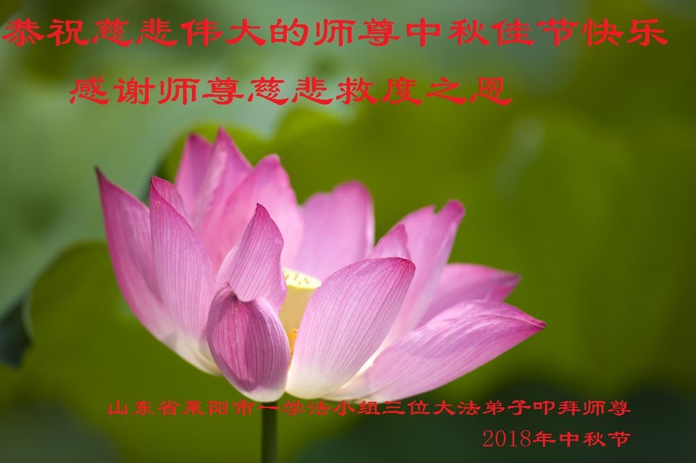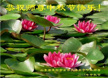 值此二零一八年中秋佳節到來之際,山東省煙台市萊陽市三人學法小組的大法弟子向師尊問好!恭祝慈悲偉大的師尊中秋佳節快樂!