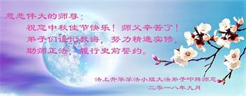 在中秋佳節來臨之際,我們學法小組全部六名大法弟子向慈悲偉大的師父問好,祝師父中秋快樂!