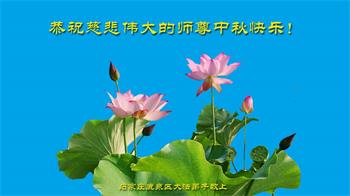 我代表十三歲的小外孫(他還沒正式修煉),他從懂事就喜歡法輪大法,「法輪大法好,真、善、忍好」已在他心中紮下了根,每次給師尊寫賀信時他都要積極參加,他讓我代表他向師父問好,祝師父中秋快樂!