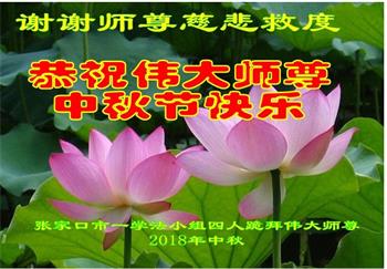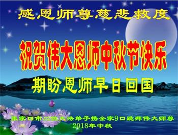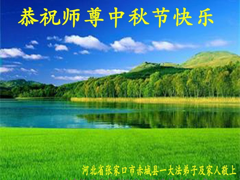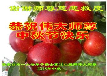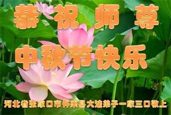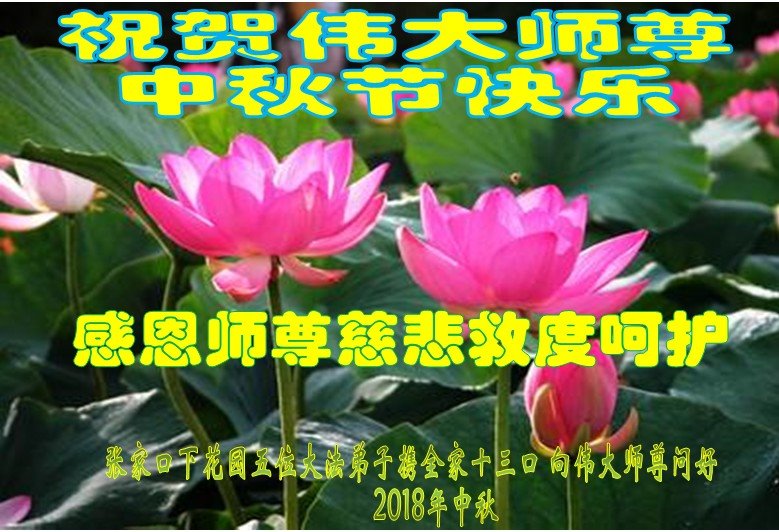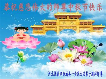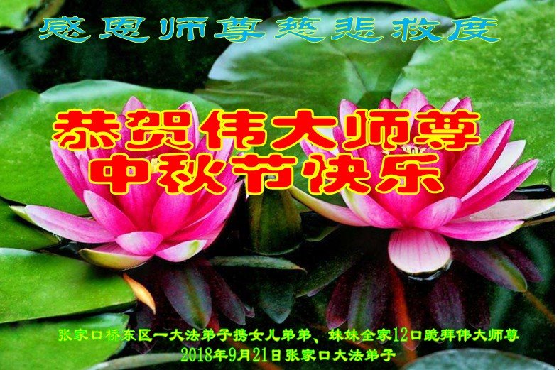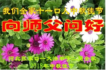 河北省張家口懷安縣大法弟子全家十三人恭祝師尊中秋佳節快樂!謝謝師父慈悲救度。一定要精進實修,去掉各種執著心,做好救人的項目,跟師尊走到永遠。師尊您辛苦了。