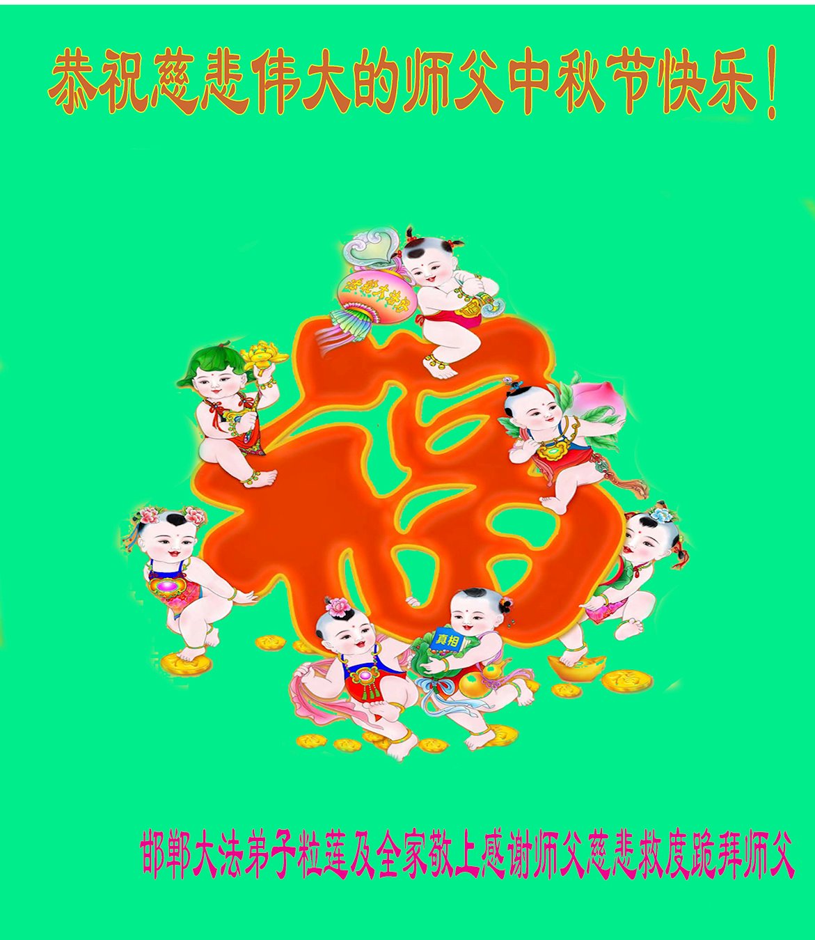 師父辛苦了!我們的學法小組弟子每天講真相勸三退,正念正行快樂!過著每一天,做著三件事。學好法,去掉一切人心執著,修好自己。讓師父多一些安慰、少一些操勞,抓緊時間去救人,只有精進報師恩,跟師父回家。師父辛苦了!弟子們叩拜師父!代我們的未修煉的家人祝慈悲偉大的師尊中秋節快樂!叩拜師父!合十