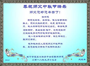 武昌白沙洲一學法小組全體大法弟子和武昌南湖花園一位被非法關押在監獄的大法弟子恭祝慈悲偉大的師尊中秋節快樂!