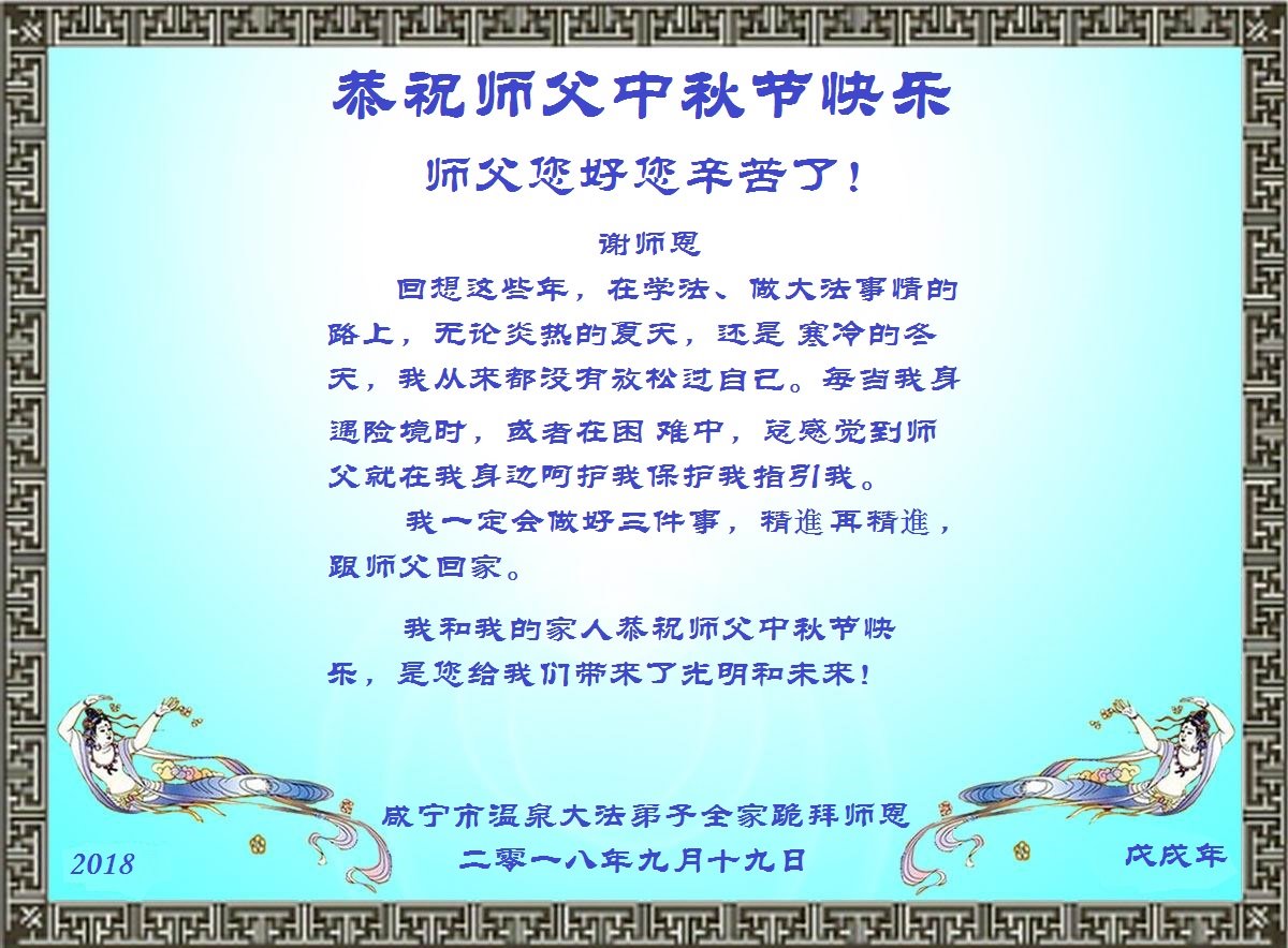 湖北省咸寧市溫泉大法弟子全家恭祝師父中秋節快樂!