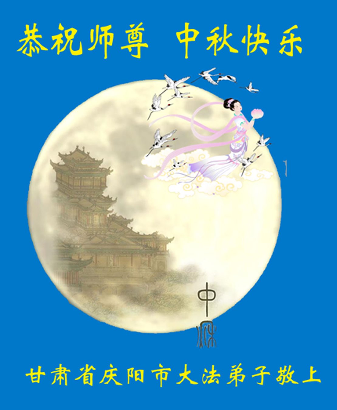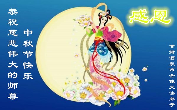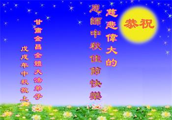 又一個中秋佳節來臨之際,我們白銀市白銀區一學法小組大法弟子懷著無比感恩之心,遙祝師尊中秋快樂!師尊啊,我們怎能忘記,億萬年的等待,千百年的輪迴,是您將我們從地獄裏撈起,洗淨,除名,又引領我們走上返本歸真、救度眾生之路。二十一年來,坎坎坷坷,如果沒有師尊的呵護,我們怎能跟師父走到今天!這浩瀚的天恩,人間的語言何以能表達得了?!我們學法小組的大法弟子,80歲左右年齡的佔大多數,還有93歲的。我們深知時間的可貴,我們只有、也一定會牢記師尊教誨,多學法,認真做好三件事,真修實修,守信踐約,不辱使命,珍惜師父用巨大承受、無量付出所延續來的寶貴時間,兌現來世的誓願,以回報師尊慈悲苦度之恩於萬一。
