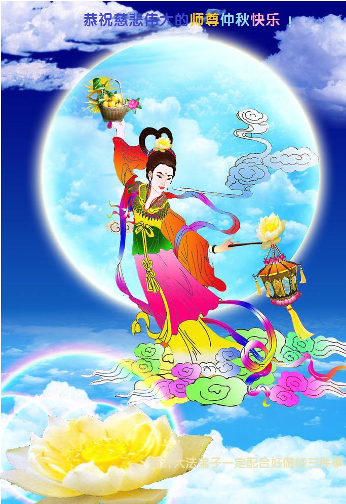 叩謝恩師救度之恩;您為弟子撣去萬古積怨,從地獄中撈起洗淨,再培育成俗世淨蓮,這個過程唯有弟子理解!師父啊您的付出穹宇難訴!弟子改掉所有私心,信師信法直到永遠。又到中秋月圓時,謝師尊賜給善良眾生千秋大團圓。
