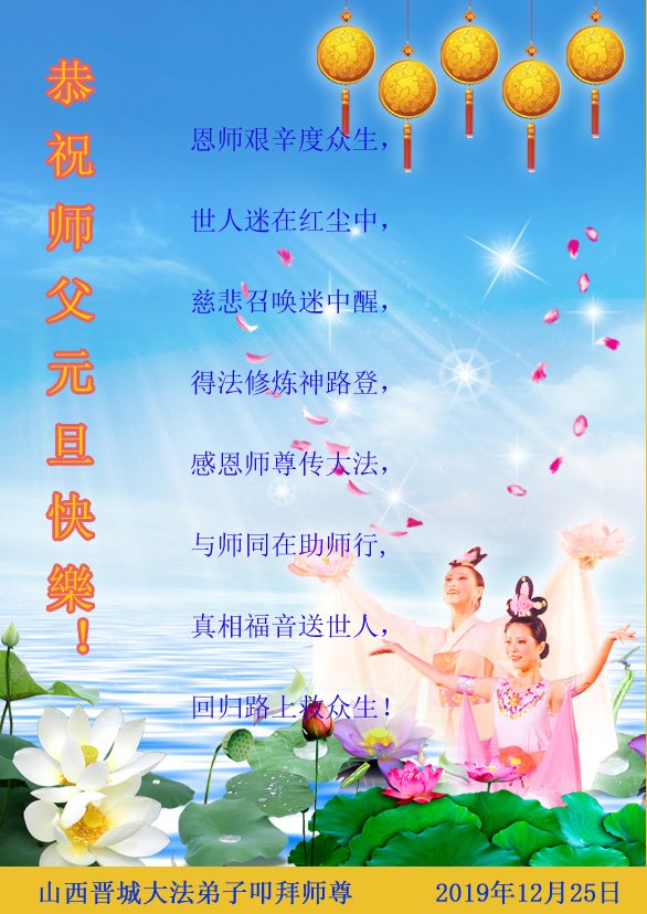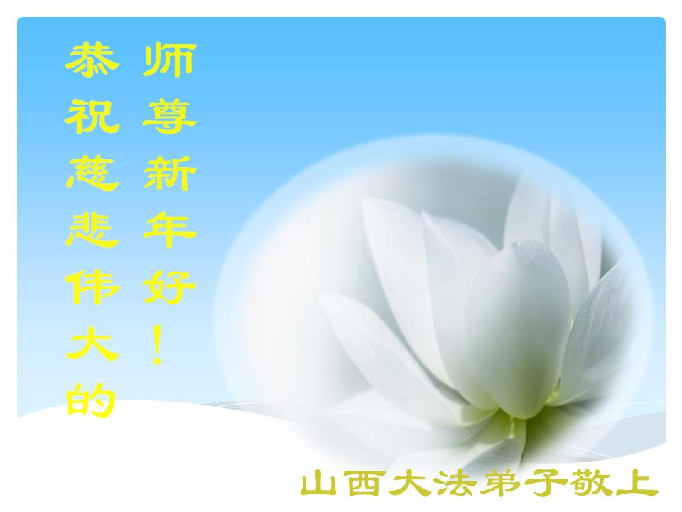 新年了,大法弟子在此跪拜師父:師父新年好!師父您辛苦了!弟子們謹記師父的教誨,做好三件事,不辜負師恩,兌現自己的誓約,做好三件事,完成大法弟子的歷史使命,走好最後的路。