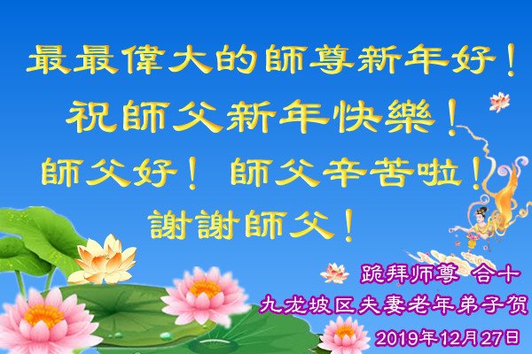 尊敬的師父:您辛苦了!舊歲即將過去,新年就快到了。在過去的歲月中,您用巨大的承受帶領著我們一步一步正走在回家的路上,這其中的艱辛無以言表!唯有聽師父的話:修好自己,做好三件事,多救人,完成來世的使命,回報恩師的救度之恩!