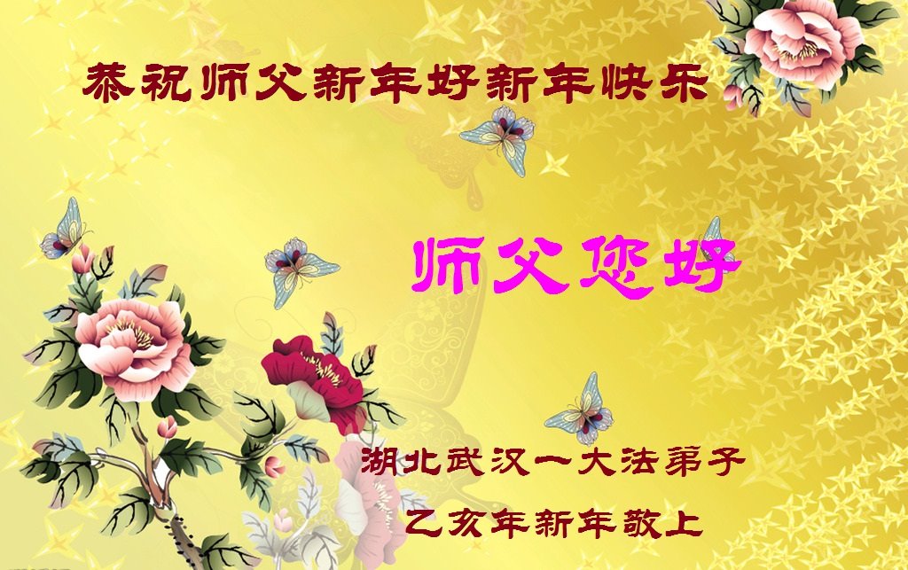 湖北武漢一大法弟子感恩師父對弟子慈悲的時刻保護,在新的一年裏弟子要好好向內找修自己,做好師父安排三件事,讓師父少一點操勞,對師父感恩的心無以言表,弟子謹在此給師父叩首拜年啦!師父您好!恭祝師父新年好!新年快樂!乙亥年新年敬上