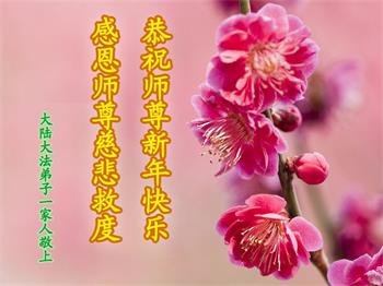 我們三姐妹及受益於大法的家人向慈悲偉大師父恭祝新年快樂!師父您辛苦了!弟子修煉二十年,您為眾生付出巨大的心血、您為眾生承受了無量的苦難,使我們能走到今天。弟子們感念師父的救度之恩!弟子明白修煉是嚴肅的,無論在任何環境下只有實修自己、才是對自己負責任、才是對世人好。在最後的時刻,我們只能跑步追趕,修好一思一念,弟子知道沒有其它捷徑,只有用心學好法,嚴格要求自己、遇事用法來衡量,才是修好自己和多救人的保障。無論路還有多遠,弟子們正念堅定,心正志堅,抓緊分分秒秒,做好三件事,完成使命。敬拜師尊!感念師恩!