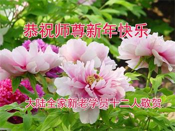 大陸全家新老學員十二人恭祝師尊新年快樂!感恩師尊救度之恩,是您「真善忍」的法理指導我們做好人,是您神奇的功法使我們全家人得到健康身體。在這新年來臨之際,我們全家表達對您的感恩!盼望您早日回到大陸。