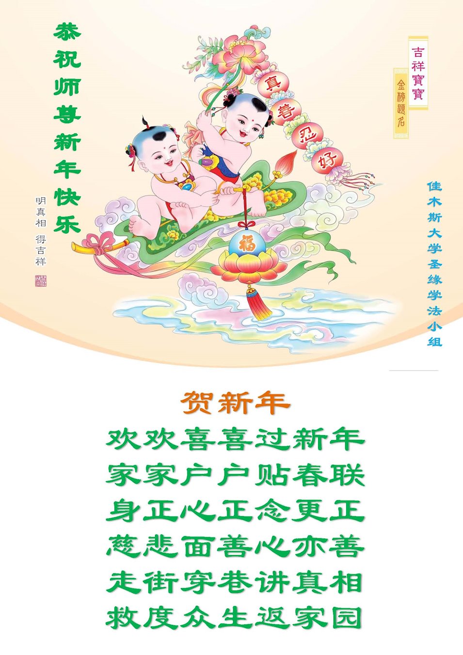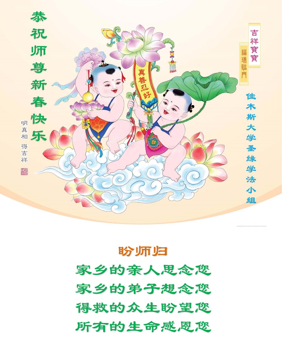 哈爾濱教育系統大法弟子恭祝師尊新年快樂!師父辛苦了!弟子要做好三件事,聽師父的話,越最後越精進,圓滿隨師還!