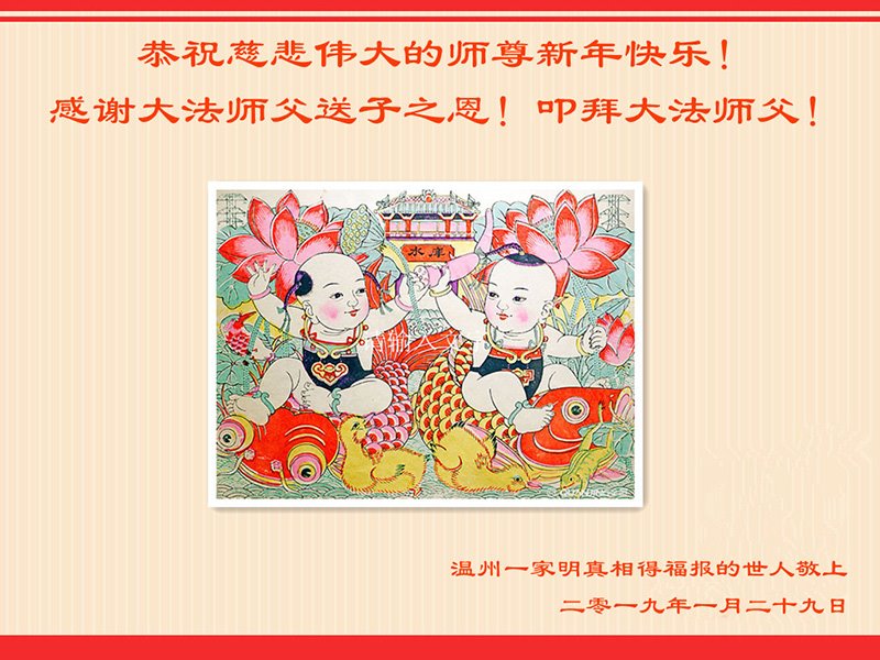 對師尊的感恩如萬萬千大法弟子和明真相得福報的善良人一般,用不盡人世間的語言。我們從心靈深處感恩師尊的慈悲苦度:「謝謝師父!師父您辛苦了!值此新春佳節來臨之際,我們一家三口叩拜師尊!衷心祝願師尊新年快樂!」在這辭舊迎新之際,我們一定努力修好自己,努力做好三件事,惟願師尊笑!