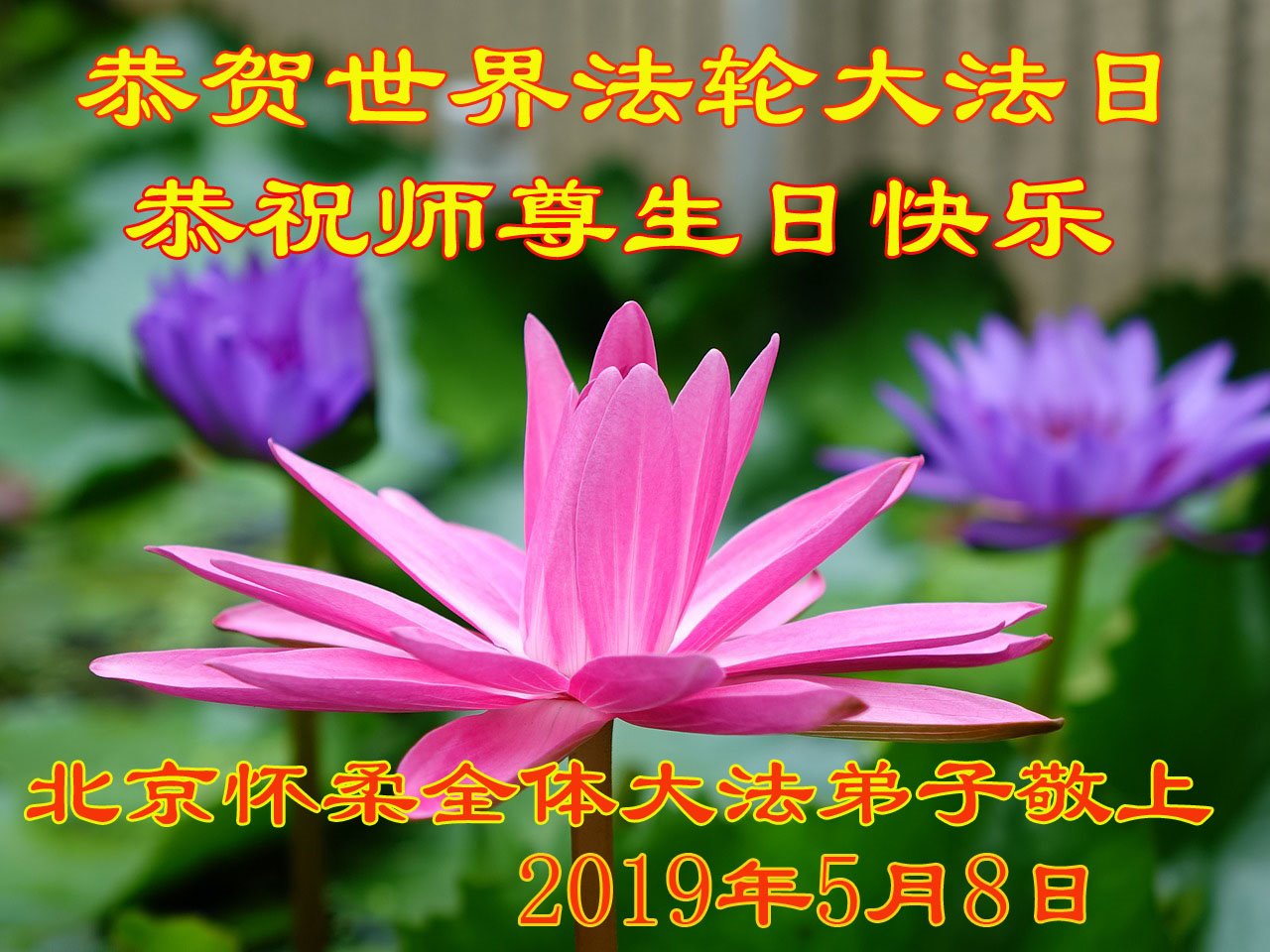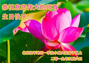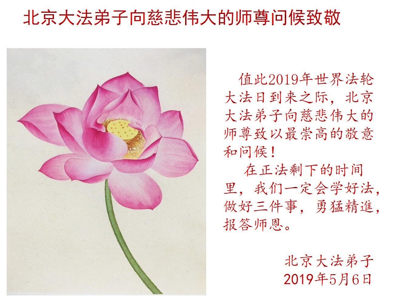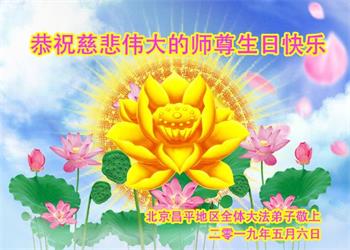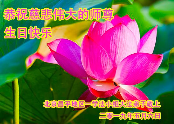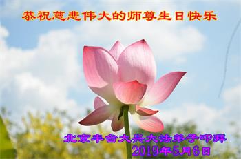 值此2019年世界法輪大法日到來之際,北京大法弟子向慈悲偉大的師尊致以最崇高的敬意和問候!在正法剩下的時間裏,我們一定會學好法,做好三件事,勇猛精進,報答師恩。