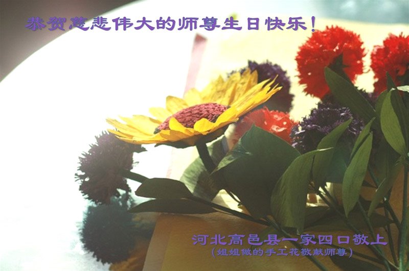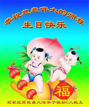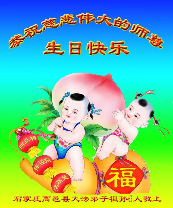 向慈悲偉大的師尊問好:師尊您好!師尊您辛苦了!恭祝師尊生日快樂!感謝師尊慈悲救度,弟子們無一回報,在正法最後的日子裏走好師尊安排的修煉路,講真相多救眾生,做好三件事,讓師尊放心。