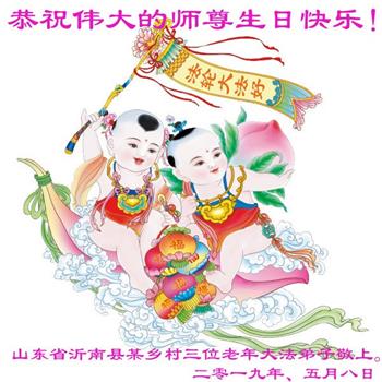 山東省臨沂市沂南縣某鄉村三位老年大法弟子恭祝師父生日快樂!
