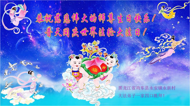 黑龍江省雞西市雞東縣永安鎮永新村大法弟子一家四口恭祝慈悲偉大的師尊生日快樂!