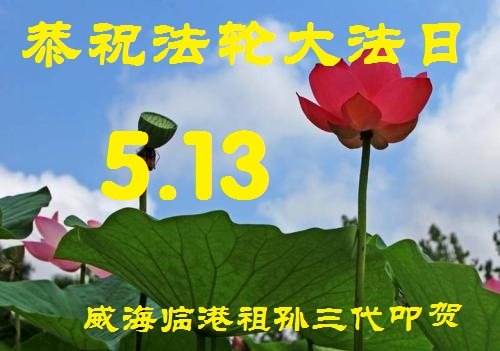 山東威海臨港區祖孫三代慶賀世界法輪大法日暨師尊華誕!