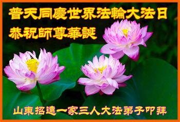 山東省煙台市招遠市一家三人大法弟子恭祝慈悲偉大的師父生日快樂!