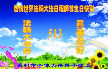 山東省煙台市萊州市全體大法弟子恭祝師尊生日快樂!恭賀世界法輪大法日!