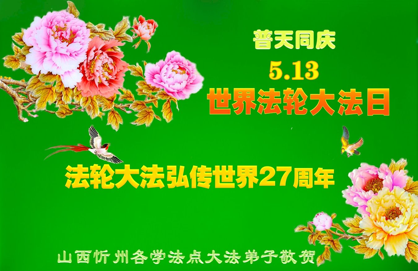 山西大同市西城學法組老年大法弟子恭祝師父生日快樂!普天同慶法輪大法日!