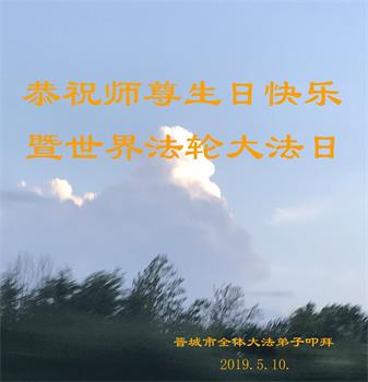在這普天同慶世界法輪大法日!暨師尊六十七華誕的喜慶日子裏,弟子九叩首感恩師尊慈悲救度!不忘初衷兌現誓約,堅定不移金剛不破,緊跟師尊正法進程,做好弟子該做的「三件事」,無愧大法弟子的稱號,讓師父多一份欣慰!合十!