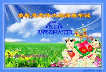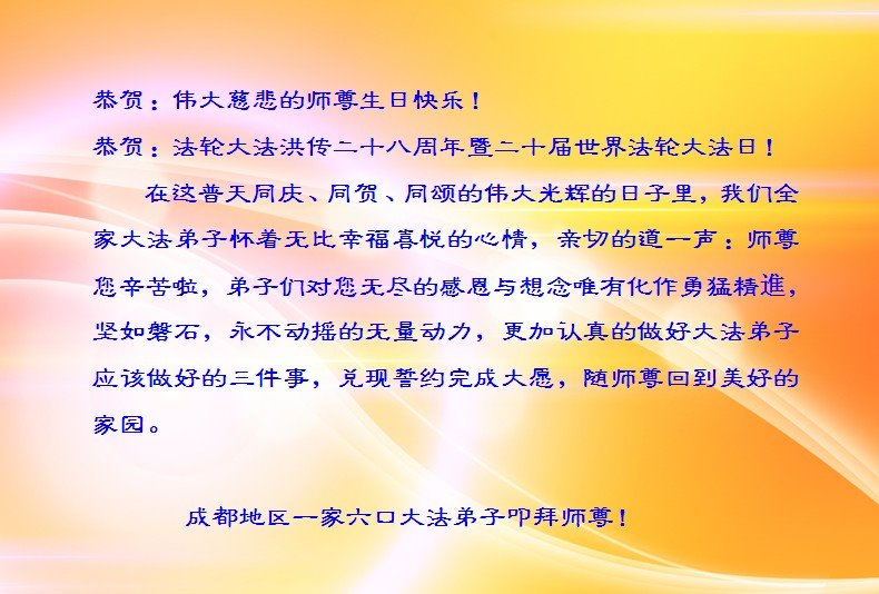 在這普天同慶、同賀、同頌的偉大光輝的日子裏,我們全家大法弟子懷著無比幸福喜悅的心情,親切的道一聲:師尊您辛苦啦,弟子們對您無盡的感恩與想念唯有化作勇猛精進,堅如磐石,永不動搖的無量動力,更加認真的做好大法弟子應該做好的三件事,兌現誓約完成大願,隨師尊回到美好的家園。