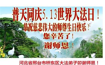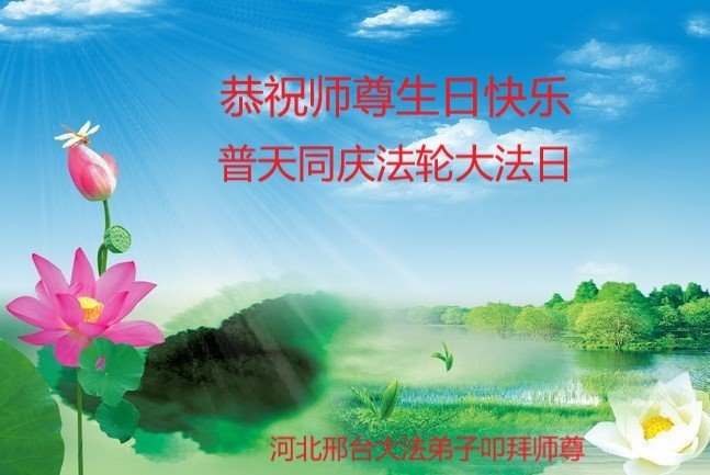 在第二十屆世界法輪大法日到來之際,河北省邢台市柏鄉縣全體大法弟子恭祝慈悲偉大的師尊生日快樂!慶祝世界法輪大法日!暨法輪大法洪傳世界二十七週年!我們深知師父的辛苦,我們深感時間的緊迫,在正法的最後時刻,我們一定精進再精進,做好三件事,緊跟師父正法進程,多救人。