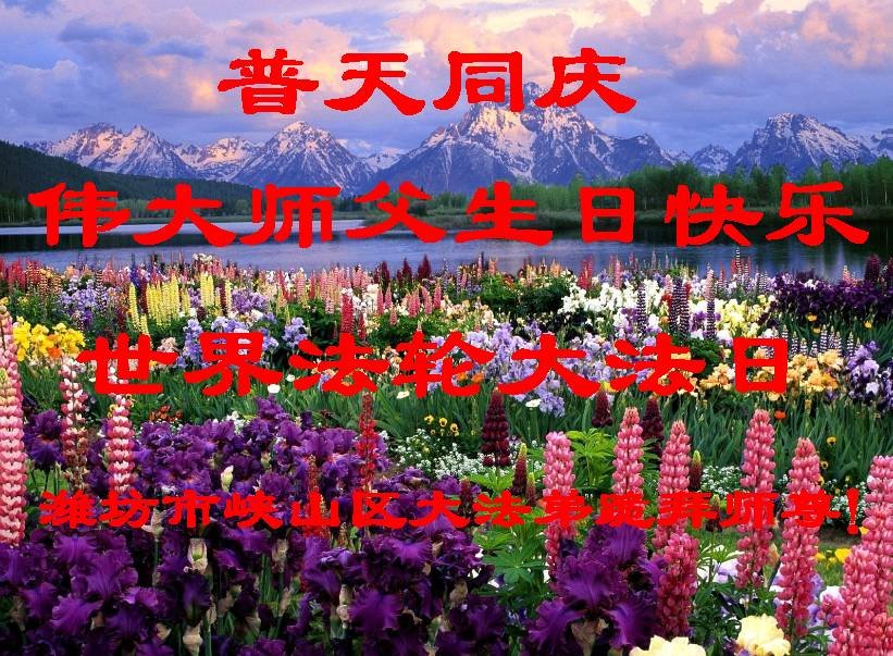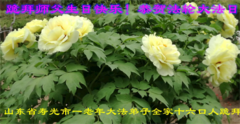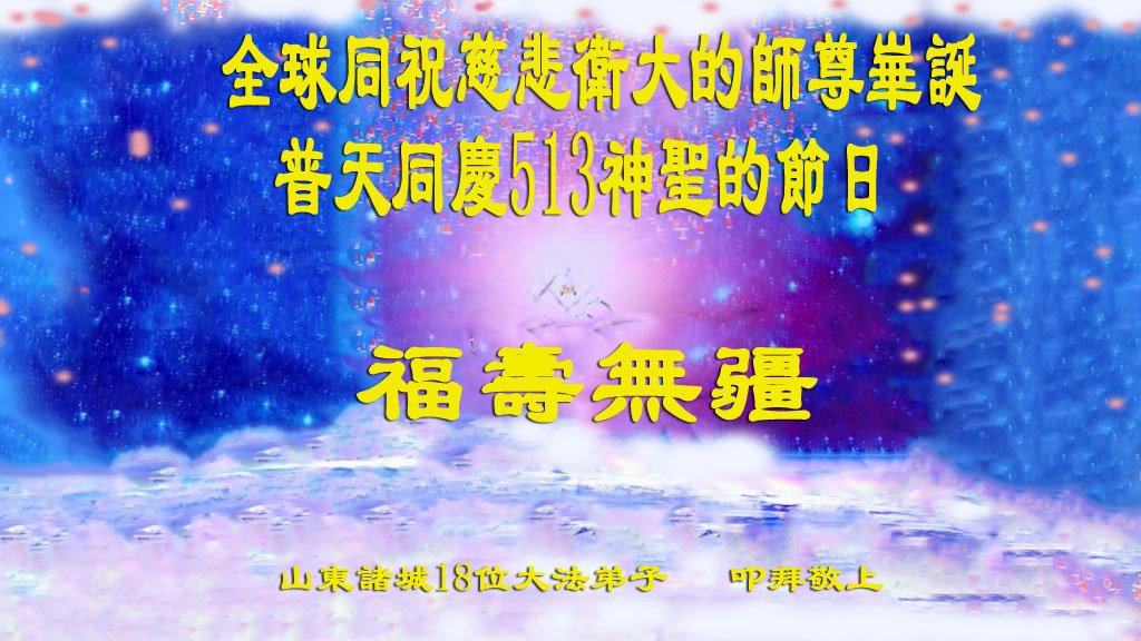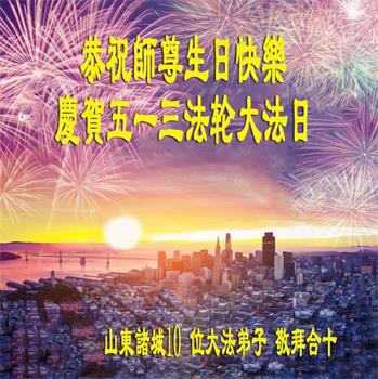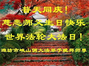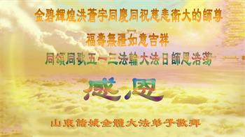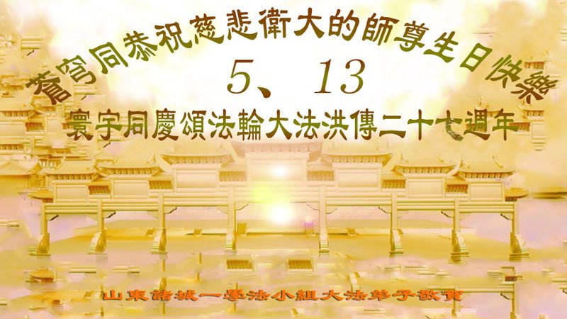 山東濰坊諸城全體大法弟子恭祝慈悲偉大的師尊:生日快樂!同慶世界法輪大法日!同頌師尊傳大法二十六週年!