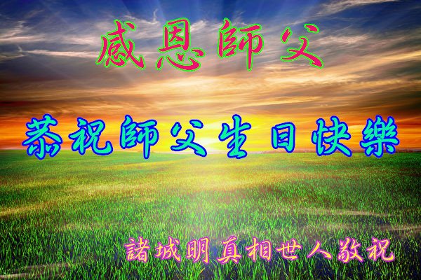 在這普天同慶的日子裏,敬祝慈悲偉大的師尊生日快樂!敬請師尊放心,在正法最後的最後,我們一定正念正行,做好三件事,完成我們的歷史前大願,決不辜負師尊的慈悲苦度,讓師父多一份欣慰,少一份操勞。
