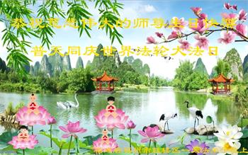 慈悲偉大的師尊您好!「五一三」是大法弟子的盛大喜慶之日,也是普天同慶之日。是師尊用巨大的付出承受,為每個真修弟子延續來修煉的時間裏,弟子要精進實修,謹記師尊教誨,多學法,學好法,修好自己,修去執著,提高心性,努力圓容好師父所要的。不辜負洪大慈悲偉大的師父慈悲苦度!不辜負師父的期望!不辜負眾生的期望!