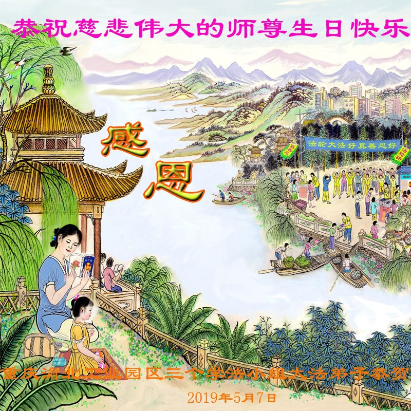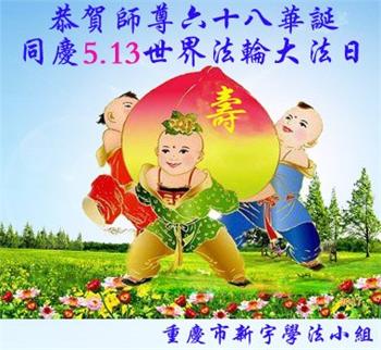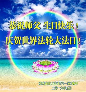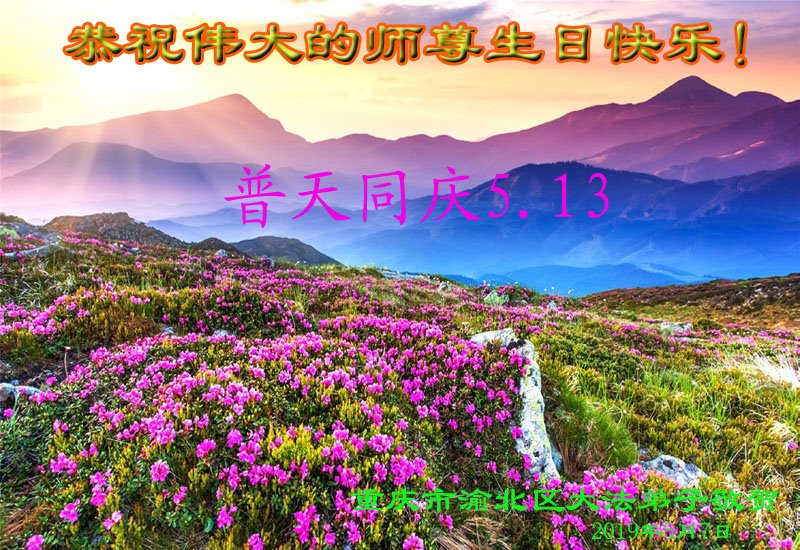 又到了萬物生長,鮮花盛開的五月,全球各地迎來了「五﹒一三」這個光輝神聖的日子,這個舉世矚目、永遠不忘的世界法輪大法日!二十七年前的今天,慈悲偉大的師尊將佛法「真、善、忍」的光輝撒滿蒼宇,使眾生沐浴在您的佛恩浩蕩中。在這普天同慶、同祝、同頌的偉大日子來臨之際,我們渝北區大法弟子滿懷無比感恩的心,由衷恭祝慈悲偉大的師尊六十八華誕!同慶世界法輪大法日!在整個大穹即毀之際,是我們偉大的師尊用身軀支撐整個大穹,用心繫緊偏離軌跡的生命,「眾生業債一身當」(《洪吟三》〈還原〉),是師尊的慈悲、師尊的承受、師尊的智慧,挽救了一切,無量無際的宇宙都是師尊的智慧所成,師尊的智慧至洪至微,無處不在,因為「真、善、忍」無處不在。茫茫人海中,師尊將我們救起;渾渾塵世中,師尊用大法洗淨我們,把我們從一個滿身業力的常人成就為一名大法弟子。我們的生命是大法給的,是師尊給的,師尊為弟子付出的心血、為弟子承受的苦難、給予弟子的太多太多,我們一直在師尊的看護下才走到了今天,師恩浩蕩呀!我們要珍惜師尊用巨大承受、無量付出所延續來的寶貴最後時間!一如既往的好好學法、修好自己,同修之間互相支持,互相鼓勵,互相配合,圓容好整體。修己與救人並重,遇事向內找,用各種方式多救眾生,兌現自己來時的洪願,回報師尊的慈悲救度之恩!圓滿登歸途!