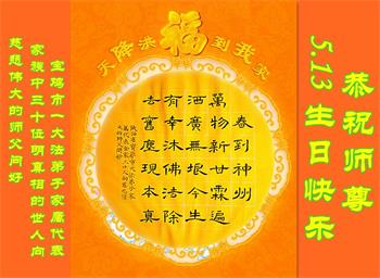 5.13是「世界法輪大法日」,又是師尊六十八華誕,我們在遠隔重洋的中國大陸通過明慧網和全世界大法弟子一起同慶、同祝、同頌師尊的浩蕩佛恩!