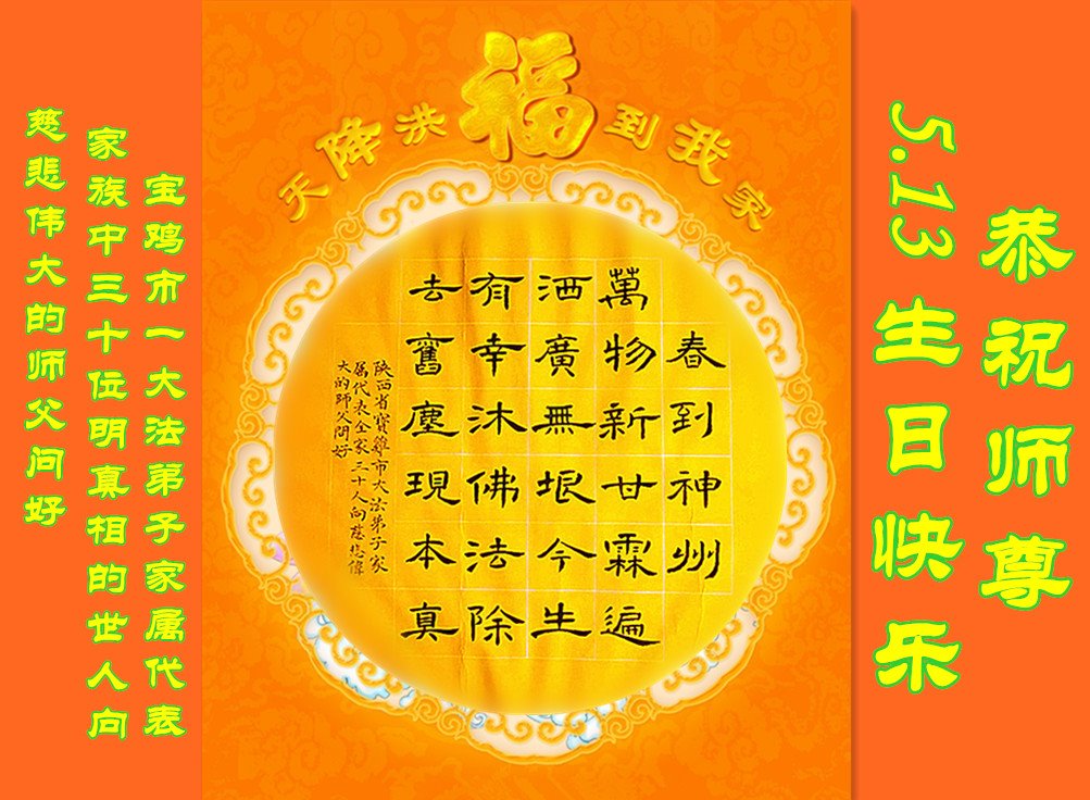 陝西省寶雞一大法弟子家屬代表家族中三十人恭祝師尊生日快樂!