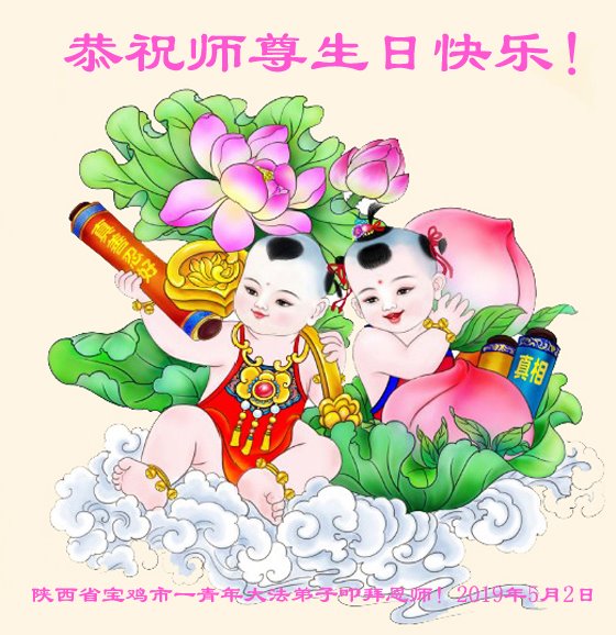 陝西省寶雞市精進實修學法小組全體大法弟子恭祝慈悲偉大的師尊生日快樂!恭賀法輪大法洪傳二十七週年!叩拜師尊的慈悲救度之恩!弟子們將堅持不懈的做好師父要求的「三件事」,修好自己,救度更多的眾生,兌現自己的史前大願,圓滿隨師還!精進實修學法小組全體大法弟子敬上!